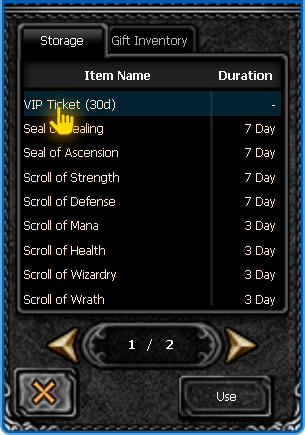 After using your VIP ticket in storage it will be moved to your inventory, there you must choose between using and receiving the benefits or marketing it with another player.