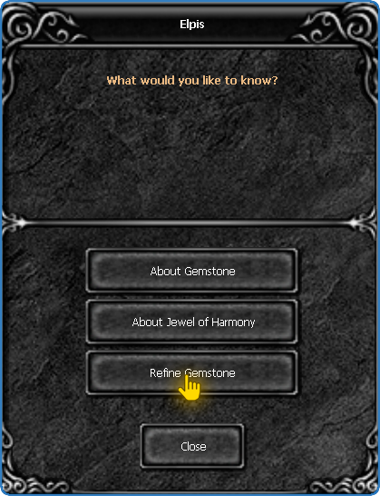 When starting the conversation with the NPC Elpis, a dialog box will appear, click on the third option called REFINE GEMSTONE. See the example below indicating where you should click:
