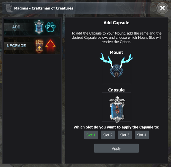 When starting a conversation with NPC Magnus, click the ADD menu to add a Monster Capsule to your mount. To select the mount and capsule, just right-click on top of both that will automatically be inserted into the combination.