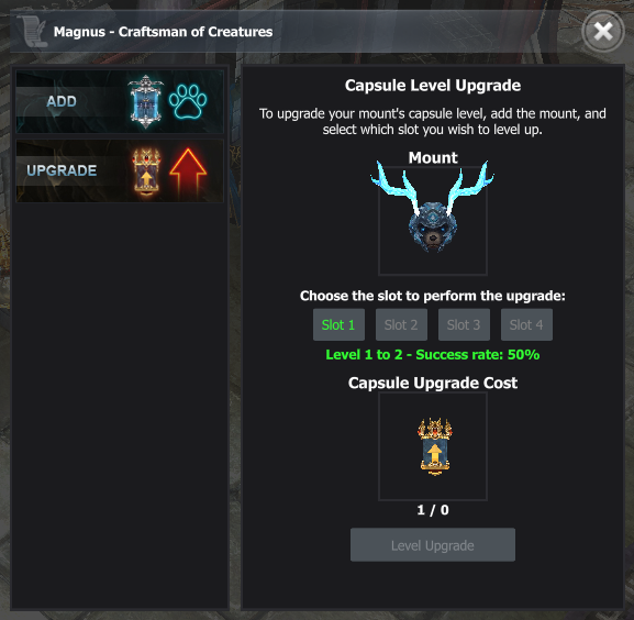 It is possible to evolve the options applied to your mount up to level 10. To do this, start a conversation with NPC Magnus and click on the UPGRADE option.