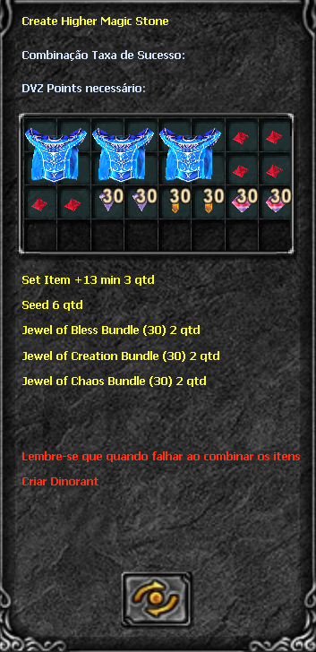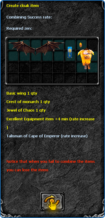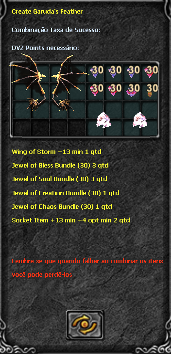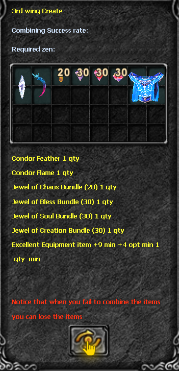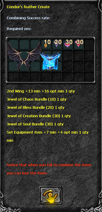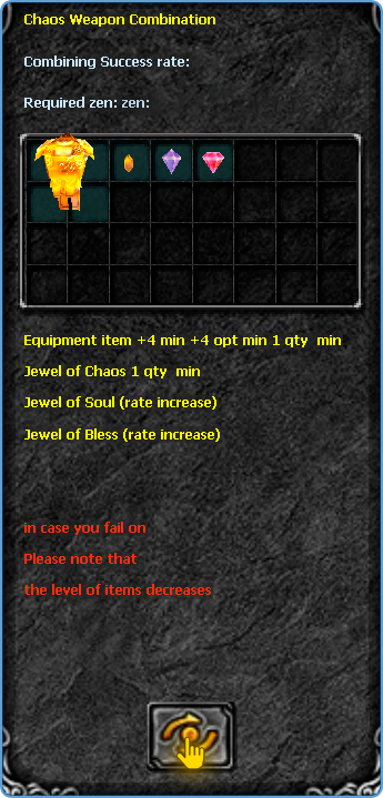 With the combination open, insert the ingredients for the combination. Remember, you can use the Jewel of Bless, Jewel of Soul and Equipment item to increase the success rate. See the example below indicating where you should click: