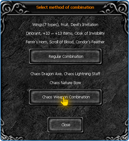 In the Chaos Machine options, you will choose the second combination option called CHAOS WEAPON COMBINATION. See the example below indicating where you should click: