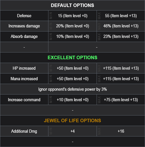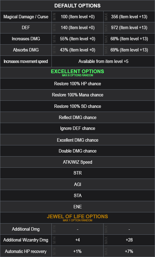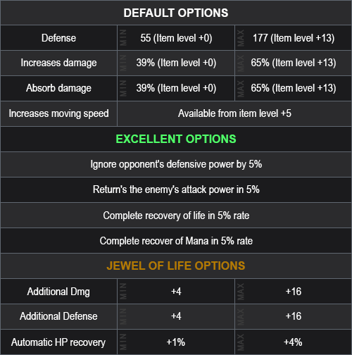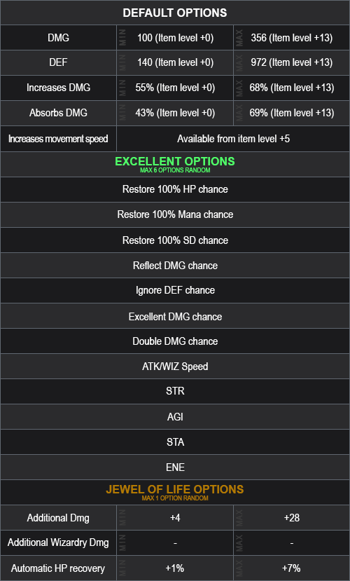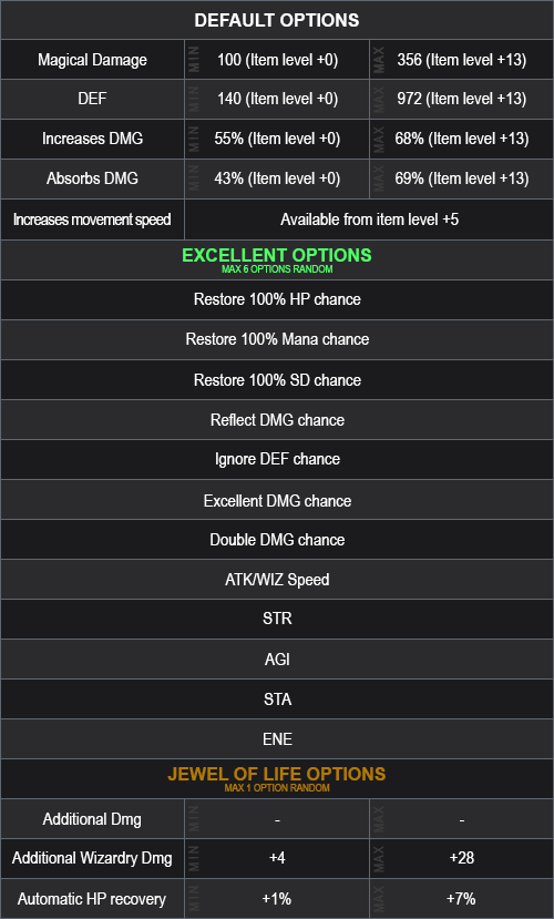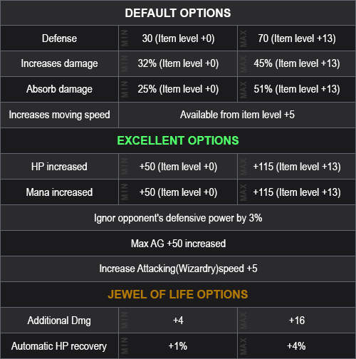 You can receive a Wing Level 4 (random) +0 with or without Luck with 3 (min) to 6 (max) options (random) and rank from 1 (min) to 4 (max) (random).